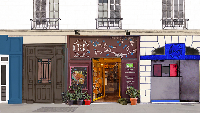 Création de l’enseigne Theine, maison de thé à Nantes, située initialement en 2017, rue de l’Arche Sèche.